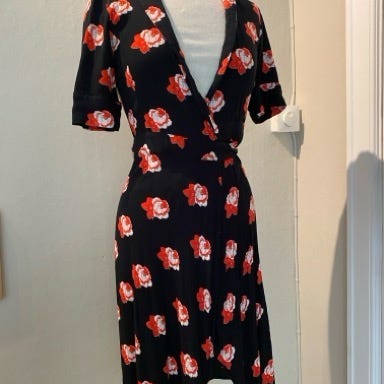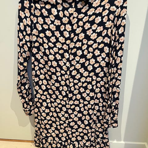 Ganni hverdagskjole i størrelse XS for kvinner. Kjolen er svart med et blomstermønster og laget av viskose.
