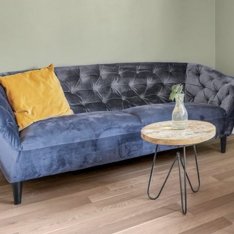 Sofa med trekonstruksjon og polstrede seter og ryggputer med mønster. Sofaen har en L-form og er dekket med stoff i grønnfarge med dekorative puter i svart og beige mønster. To runde trebord med lys overflate følger med.