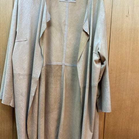 Sort skinnkåpe med pelsbesetning i front inkludert krage. Ser bra ut, men reparert(sydd) i foret inni på ene ermet. Derfor selges billig. Fin og varm kåpe