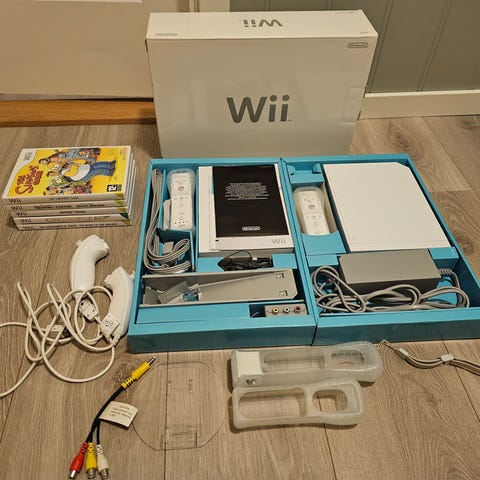 Nintendo Wii pakke med Mario kart og div tilbehør selges😁 selges med 2 Wii kontrollere, 2 nunchucker og 1 spake. Følger også med et Mario kart ratt som er brukt, men ligger i eske og plast. Og et Wii sport utstyrssett i eske. Det er også brukt😁