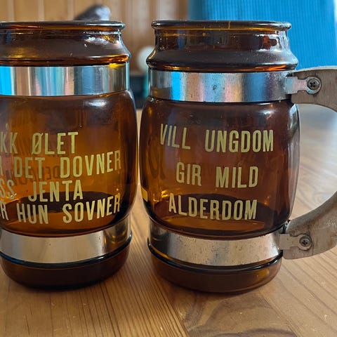 Selger 4 stk vintage ølkrus fra 1970 tallet for kr 50,- pr stykk . De selges kun samlet og da bli totalprisen kr 200,- De er pene og dekorative 3 av de har lik størrelse og har diverse tekst og motiv på seg , det 4 kruset er litt mindre og har ingen tekst og motiv . Alle har hank av treverk og alle 4 har den samme brune glassfarge . De har ingen skår eller nag og ser ut til og ha vært lite brukt .💐