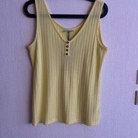 Singlet i en frisk og fin gulfarge. Lengre modell. God å ha på seg, mye stretch.