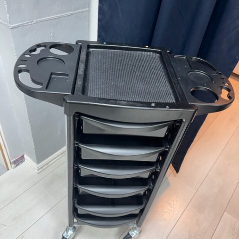 Trillebord (hvitlakkert) med hjul, 3 hyller, og 1 låsbar skuff.