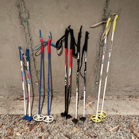 Madshus Raceline 140, smørefri. Kr 200, 4 par staver, Leki, 75 og 85 langrenn, Frost 80, Leki 80 slalom. Kr 50 pr par.