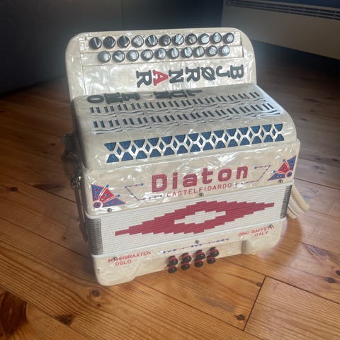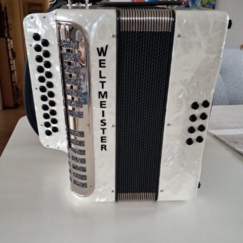 Piano trekkspill DELICIA i perfekt stand. Nydelige toner. 80 basser, 2 bassregister og 7 register i diskant.