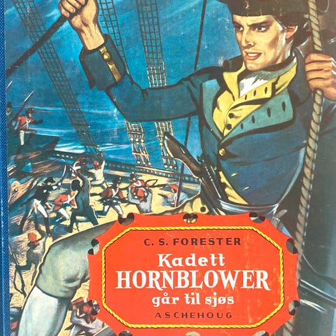 C.S.Forrster - Midshipman Hornblower - oversatt til norsk av Odd Fryst, utgitt i 1950 av Aschehoug & Co. Innbundet. Litt frynsete i et omslagshjørne, ellers som ny. Omslag mangler.