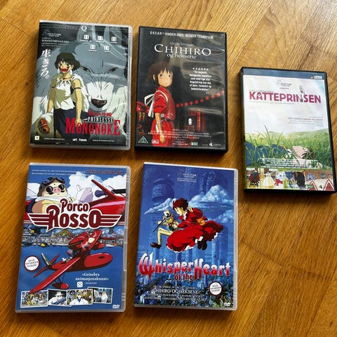 Diverse film frå Studio Ghibli på DVD. Alle er på engelsk med unntak av Ponyo, Arietta og Chihiro og heksene (norsk) og Nausicaä (tysk DVD med engelsk dub på lydsporet).