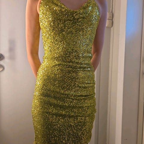 Elegant svart kort kjole med paljetter over det hele. Off-the-shoulder på den ene siden, og ett langt erme med litt puff. Fin detalj på siden i midjen. Pent brukt.