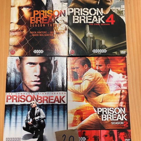 Prison Break DVD-serie som inkluderer sesong 1, 2, 3 og 4. Serien er på norsk og inneholder flere episoder per sesong. DVD-ene er i standard DVD-format.