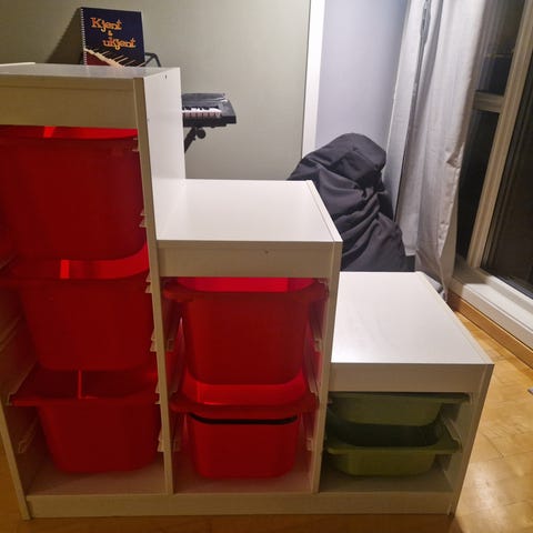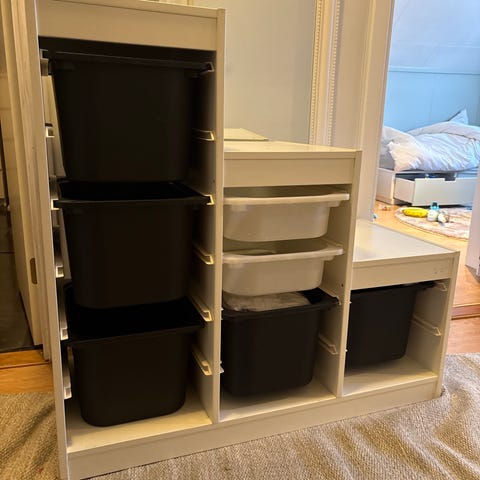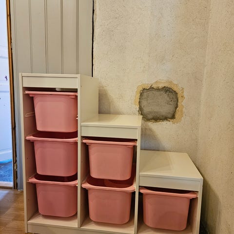 Trappehylle med rosa bokser/skuffer selges. Godt brukt men lite slitasje/merker. Ved henting før søndag kan pris diskuteres