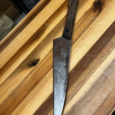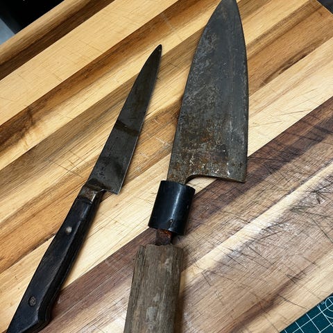 Tradisjonell japansk kjøkkenkniv Deba. Ligger tungt i hånden. Til tross for rust og en fiks med kobbertråd gjort av knivens japanske eier er kniven i fungerende stand. For noen som har interesse for restaurasjon kan dette være et spennende prosjekt.