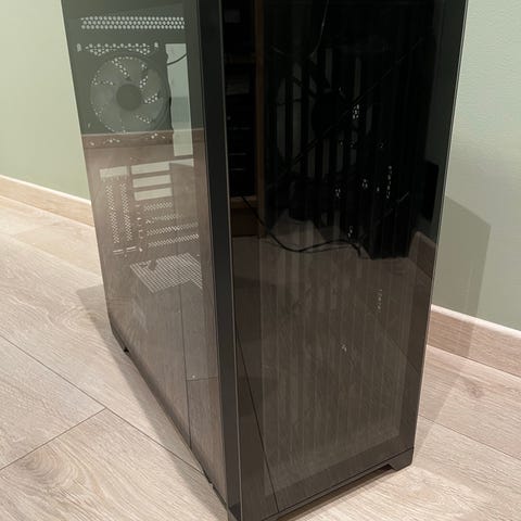 Glasspanel på siden som gir god oversikt over komponenter og RGB. Kabinettet har flere porter i top inkl. 2 USB 2.0 og 1 USB 3.0 + lyd ut og inn (3,5mm), On/Off-, reset- og LED-knapp.