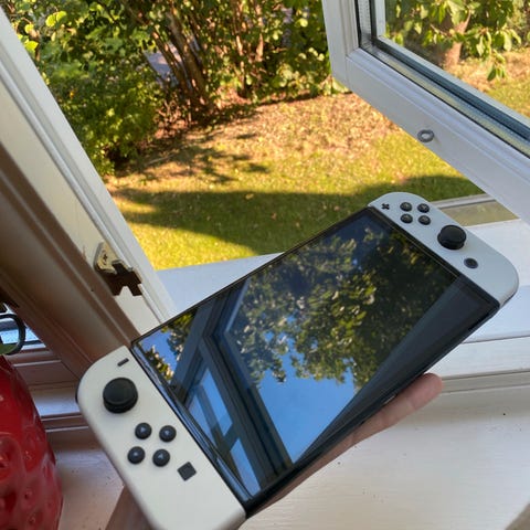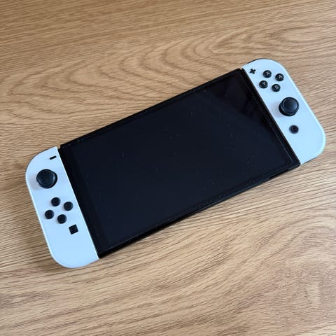 Nintendo Switch konsoll med hvite Joy-Con-kontrollere. Inkluderer dokkingstasjon, ladeutstyr, bæreveske, to ekstra Joy-Con-stropper, og to ekstra kontrollere med lys og Mario-tema. Passer for bruk med Nintendo Switch spillkonsoll.