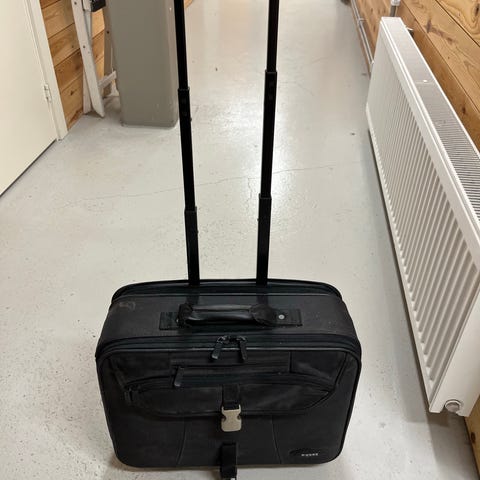 Håndbagasje kofferten tror jeg ikke er brukt. Bare samlet litt støv. Fremstår som ny i stoffet.