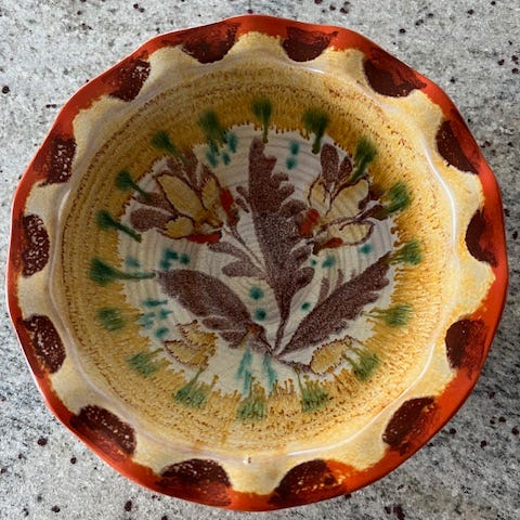 Vintage serveringsskål i tinn med keramikk