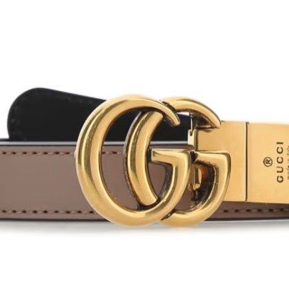 Gucci dame belte i svart lær med perlebesatt dobbel GG-spenne i gullfarge. Beltet har flere hull for justering og er laget for damebruk.