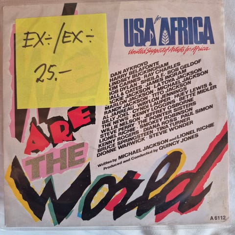 Pent brukt utgave av 7" We Are The World selges til en ålreit pris. Utgitt på CBS Records i 1985. OBS: 45 RPM! Hentes på Grønland eller sendes Fiks Ferdig. Se gjerne mine andre annonser, jeg har en del vinyl til salgs, og sender gjerne flere sammen.