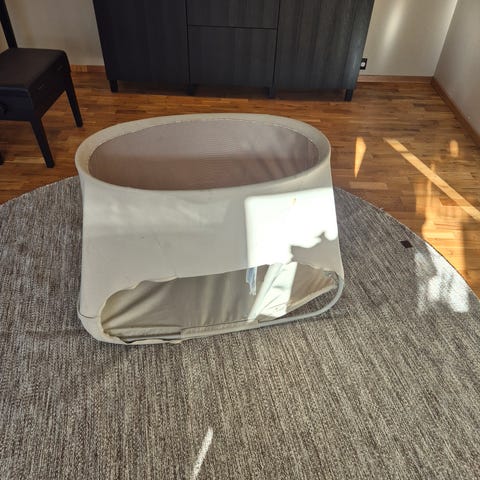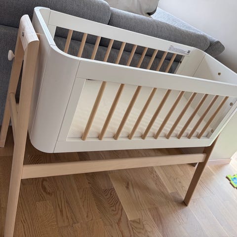 Stokke Vugge barnemøbel i lys farge. Designet for barn med sikkerhetssele og myke materialer. Brukes som en trygg soveplass for små barn.