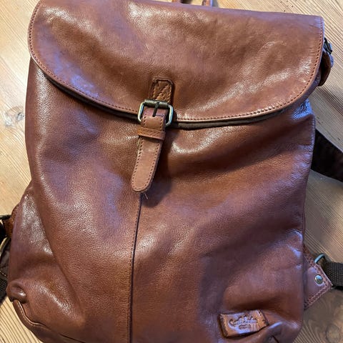 Stilren ryggsekk i ekte skinn, i varm brun tone.