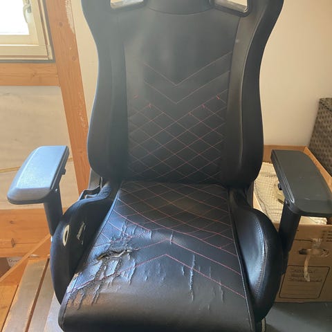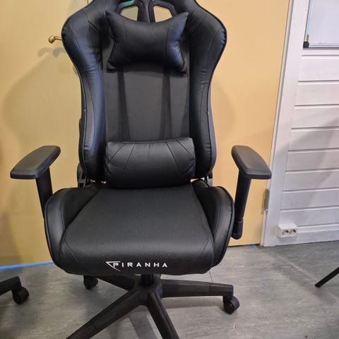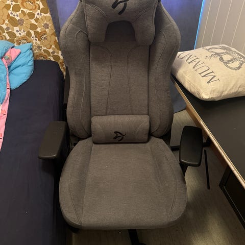 Gamingstol med kamuflasjemønster, justerbare armlener og hjul for enkel bevegelse. Stolen har høy rygg og polstret sete for komfort under bruk.