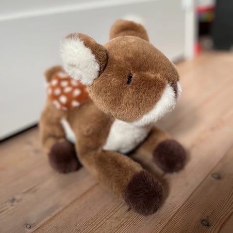 Den er ca. 50 cm høy. Har stått som pynt og ikke lek. Ingen flekker eller merker. Kommer fra et Røyk og dyrefritt hjem.