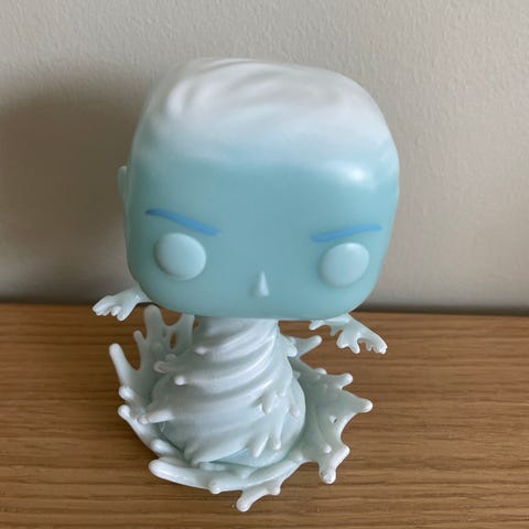 Selger en stilig Funko Pop-figur av Iceman fra Marvels X-Men. Dette er nummer 504 i "Marvel 80 Years"-serien, som feirer karakterens første opptreden (First Appearance). Figuren er laget i en gjennomsiktig blå plast for å gi den rette is-effekten, og han står på en "is-base".