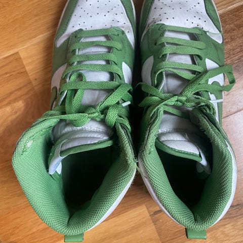 Selger Nike Dunk High i grønn/hvit.