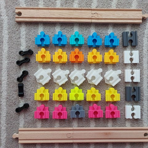 Lave adaptere til å koble tretogbane Brio/Ikea og Lego Duplo byggeklosser og kobler hunn-hunn og hann-hann til skinner av tretogbane.