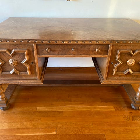 Selger et vakkert, tidstypisk skrivebord i tradisjonell engelsk stil, også kjent som "pedestal desk" eller "kneehole desk"