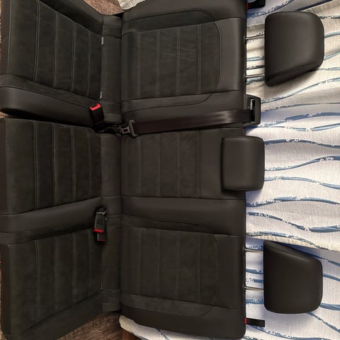 VW Amarok bakseter i delskinn/alcantara med armlene og integrerte koppholdere. Setene har ISOFIX-fester for barneseter.