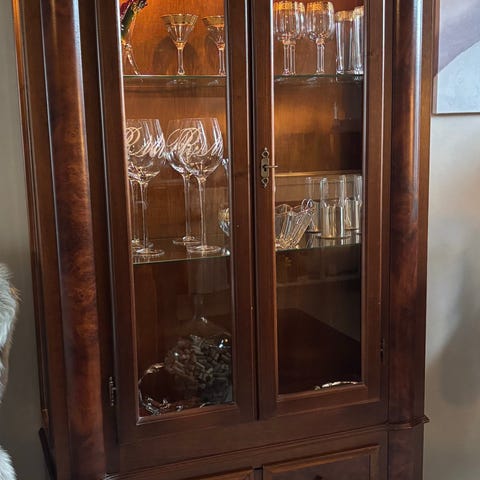 Selger dette, da vi skal bytte stil i stuen. Kjøpt på Frøken Linn på Trægården - Ranheim for ca 10 år siden. Meget dyrt og solid vitrineskap.