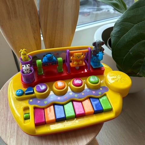 Pianoet kan spille 6 forskjellige melodier og ditt barn kan velge mellom to instrumenter, nemlig piano og xylofon. Men det er også mulig å velge dyrelyder fra hund og katt, og så kan ditt barn enten spille med på melodiene eller selv spille helt fritt.