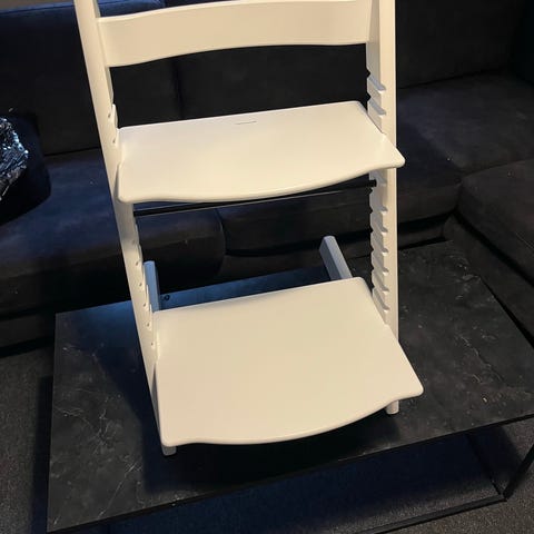 Stokke Tripp trapp høy barnestol i grå farge. Designet for barn med justerbar sitte- og fotplate for tilpasset komfort og støtte.