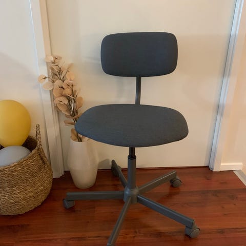 Kontorstol med sete og rygg i rottingmateriale og grå pute. Stolen har hjul og justerbar høyde, egnet for bruk ved skrivebord.