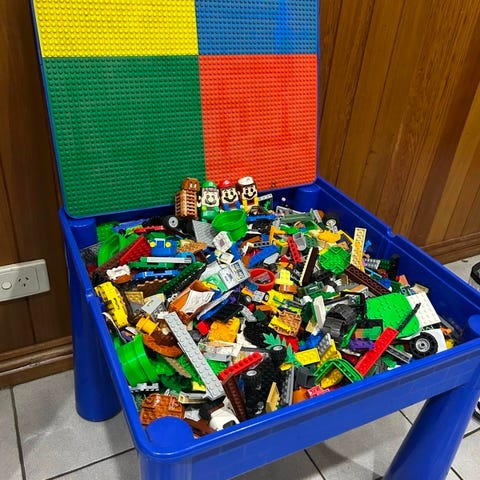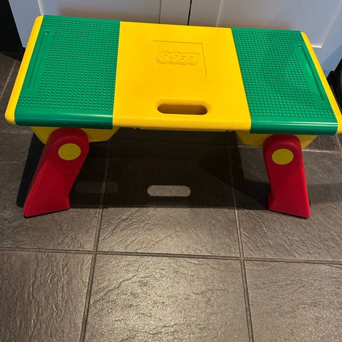Flott og solid legobord sendes videre på nye eventyr. Veldig praktisk, legoplatene kan skyves sammen til en stor plate, de fungerer også som lokk over beholderene. Her kan to bygge fra hver sin kant samtidig. Sammenleggbart og med håndtak. Her har det vært tilbrakt mange, kreative timer! Ene platen har fått en sprekk som er teipet fra baksiden, en liten sprekk i den andre, se bildet. Det har vært brukt slik, det har ingenting å si for byggingen. Lett å holde rent. 80 x 50 x 45, 14 cm bredt sammenlagt. Kan eventuelt sendes.