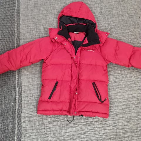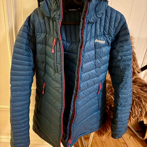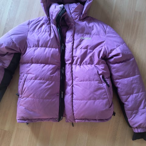 Bergans dunjakke i størrelse M for dame. Jakken er rosa og laget av dun, egnet for utendørs bruk. Ingen hull, veldig fint brukt, god og varm.