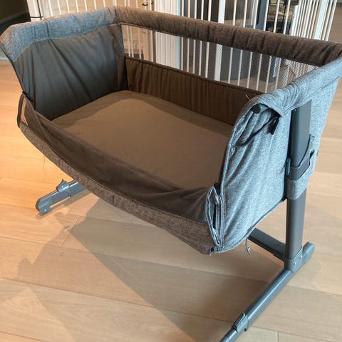 Yngri Tova bedside crib i beige, kjøpt på barnas hus i 2025. Den ble satt opp, men er aldri brukt. Har bare blitt stående og samlet ting.