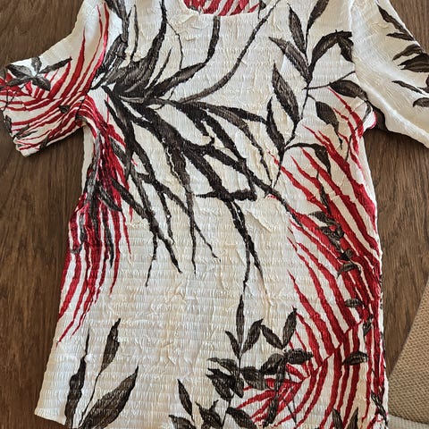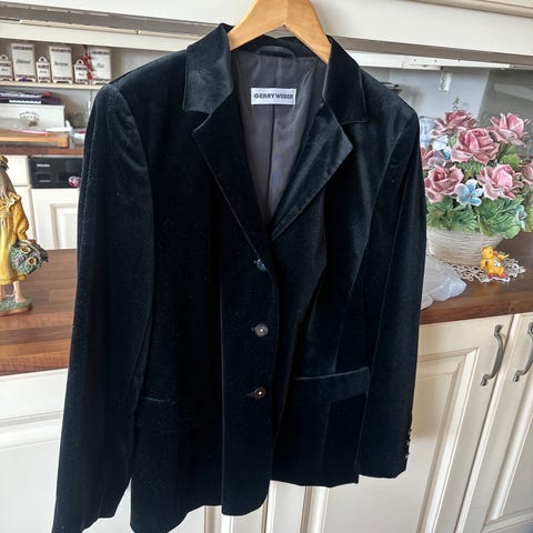 Brun kardigan str 40 med blomsterpynt laga av fløyel og paljetter. Jakka har V-hals med kvite kantdetaljar og knappar forma som hjerter. Blandingsmateriale i bomull, viscose, polyamid, kashmir og angora.