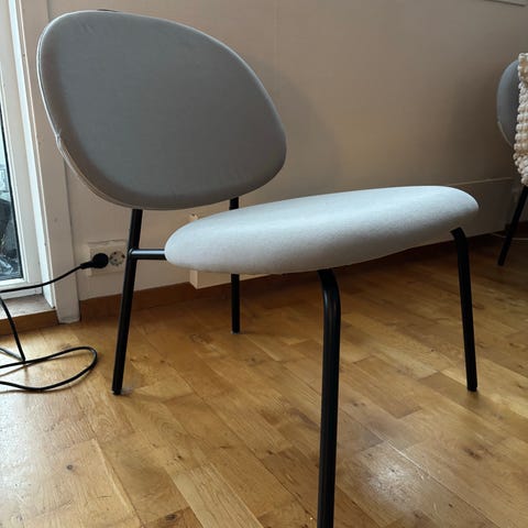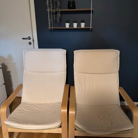To lenestoler fra IKEA. Beige farge. Den ene stolen mangler trekk til sittepute.