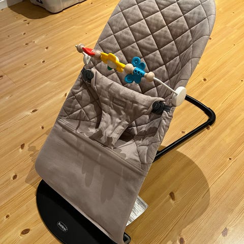 Pent brukt BabyBjørn vippestol i grå farge. Designet for små barn med tekstilmateriale som gir komfort. Egnet for bruk som hvilestol eller lekeplass for barn.