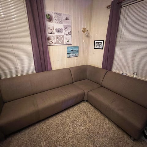 Brukt hel Brunstad sofa med noen fargeforskjeller. 217 cm x 238 cm passer godt til mindre rom. Sofaen har sjeselong og denne siden er 238 cm