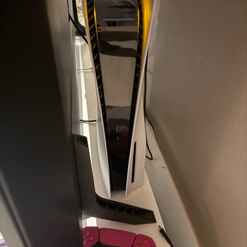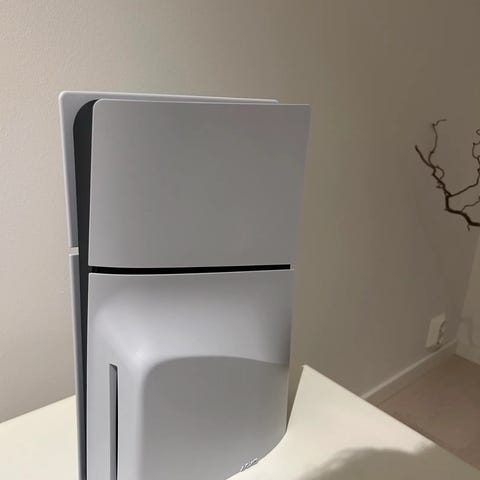 Sony Playstation 5 spillkonsoll i hvit farge. Spillkonsollen er designet for hjemmeunderholdning og støtter moderne spill med høy ytelse.