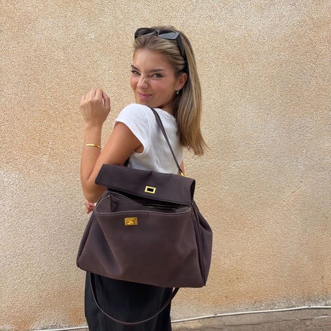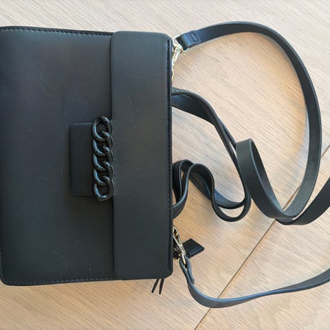Søt veske med sorte og hvite striper. Rommer mye, men liten og nett.