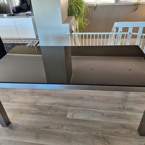 Den er 120x200 sånn som den står nå og bordplate er 76cm høy.