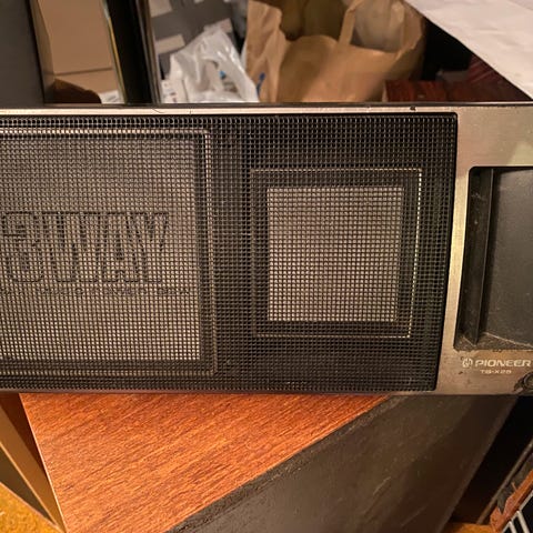 Ooldschool høyttalere som spiller rått. Alt virker, terminal er løsnet på den ene høyttaleren.