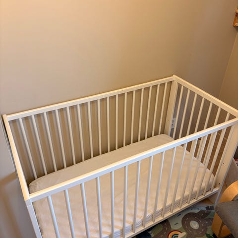 Solgul IKEA Sprinkelseng i hvit farge. Laget for barn, med spiler som sikrer god lufting og trygghet. Passer til små barn og gir en stabil og sikker soveplass. Selges med madrass fra Jysk.