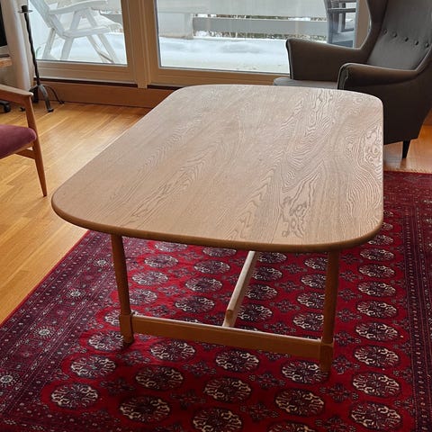 Eik, rundt bord. 1 har et større avlangt bord m samme ben, stil og farge
