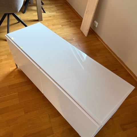 Selger vår fine benk / skap. Perfekt for oppbevaring og til å ha TV på. Det er egentlig en TV-benk fra IKEA (BESTÅ). Vi kjøpte en hvit glassplate som ligger oppå. Denne kan bare tas av om man vil. Det er en skuff i midten og skapdører på sidene med trykkåpning. Det er hull midt på bak for ledninger (se bilde). Den kan henges på veggen, ellers får man også kjøpt bein på IKEA, hvis man ønsker det.