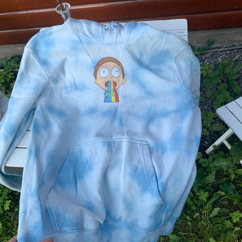 H&M Rick and Morty genser i brun farge, størrelse S for herre. Laget av bomullsmateriale. Genseren har hette og grafisk trykk med Rick and Morty-tema. Cartoon network