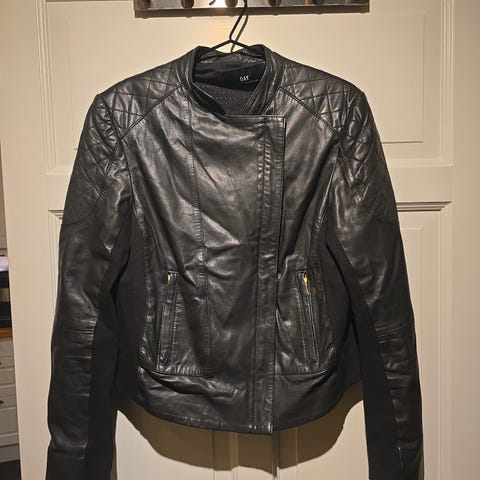 DAY Birger et Mikkelsen. Skinn, brun farge, størrelse 36. Jakken har quiltet design med knapper foran og lommer. Laget av 100% lammeskinn med fôr av polyester og viskose.